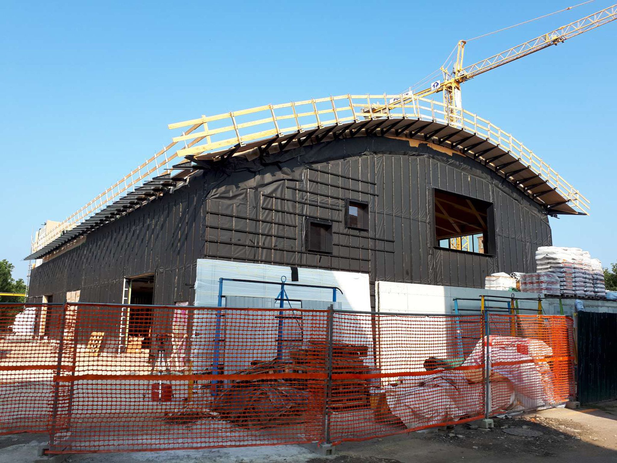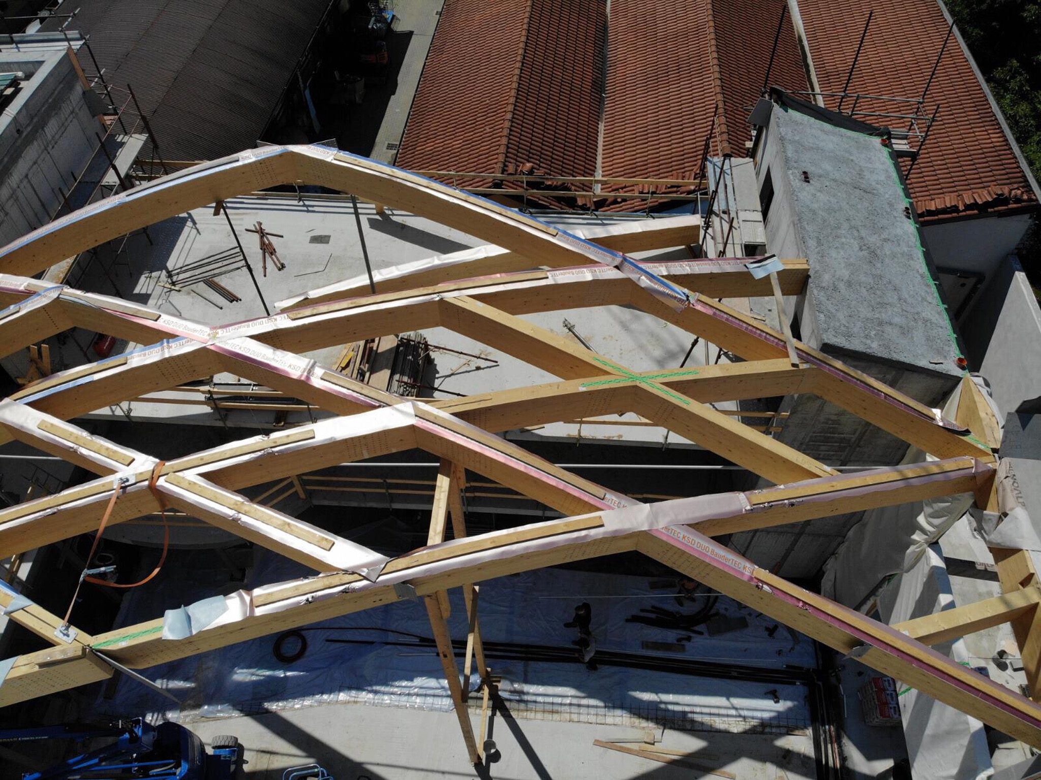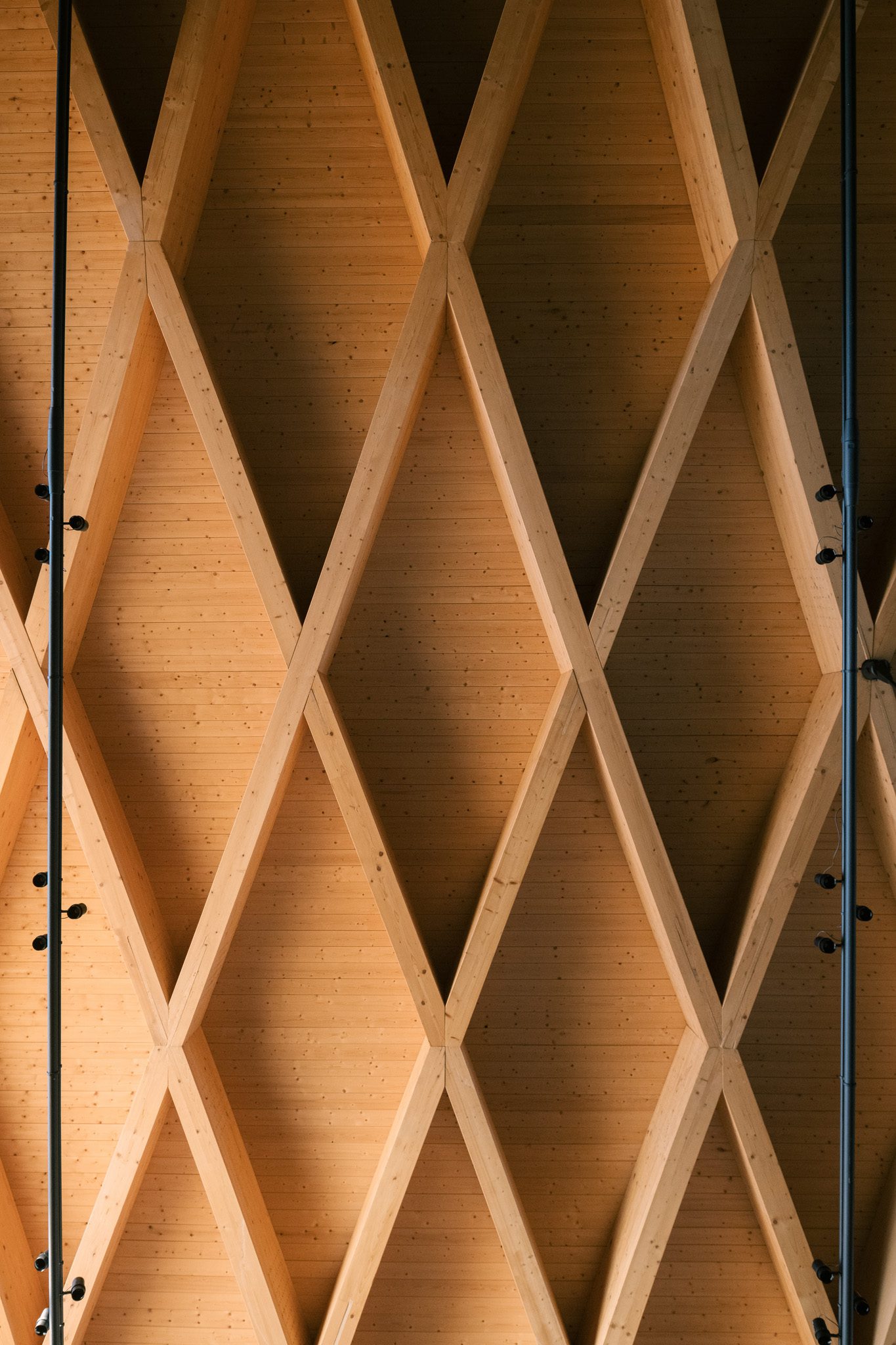 The defining element of the intervention is the new roof, built with a coffered system composed of double‑curved glulam beams and steel carpentry, ensuring both structural stability and visual lightness. Spanning approximately 23 metres and reaching a maximum height of 10.50 metres, the structure creates a spacious, technically sophisticated and sculptural volume that aligns seamlessly with the winery’s historical and material identity.