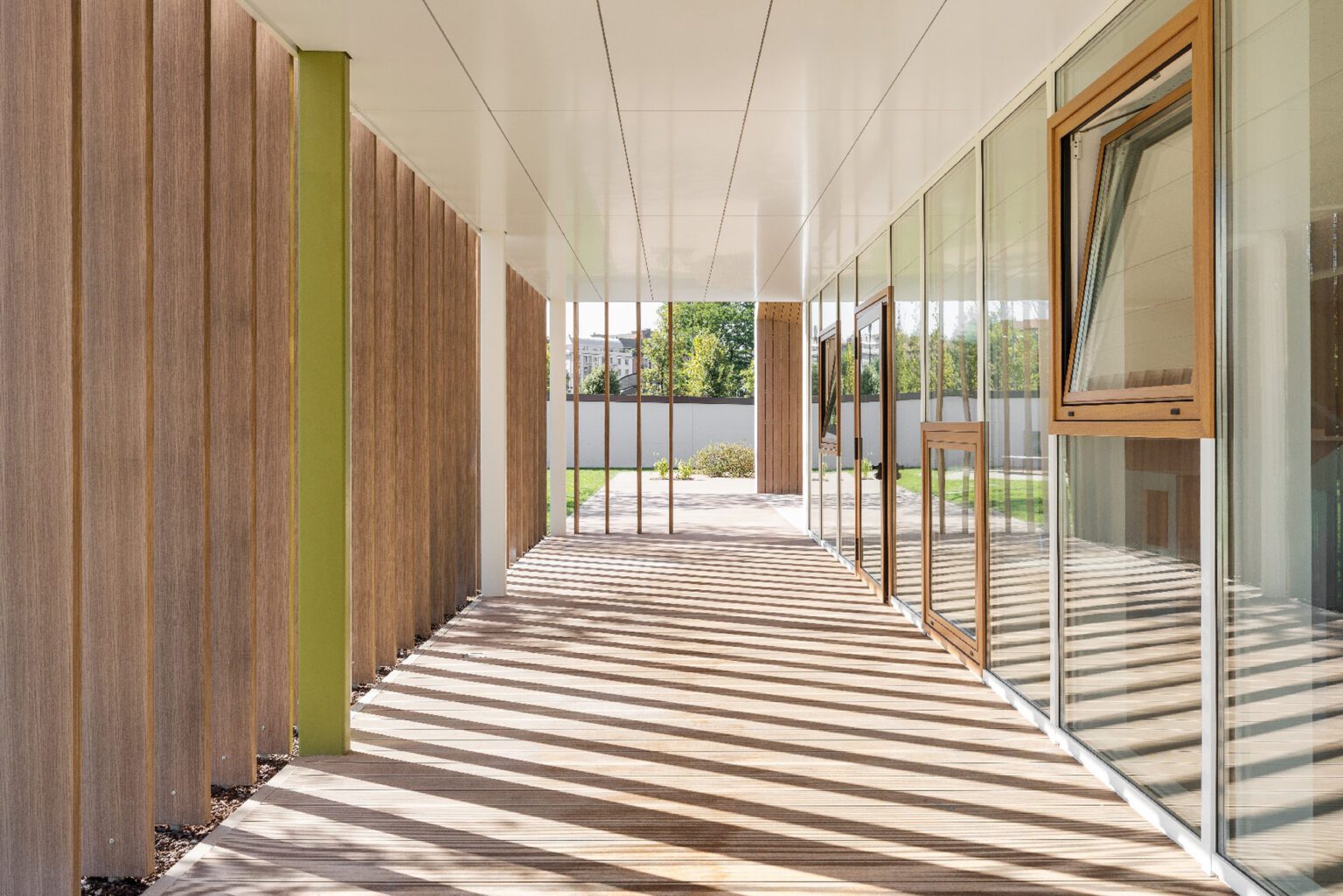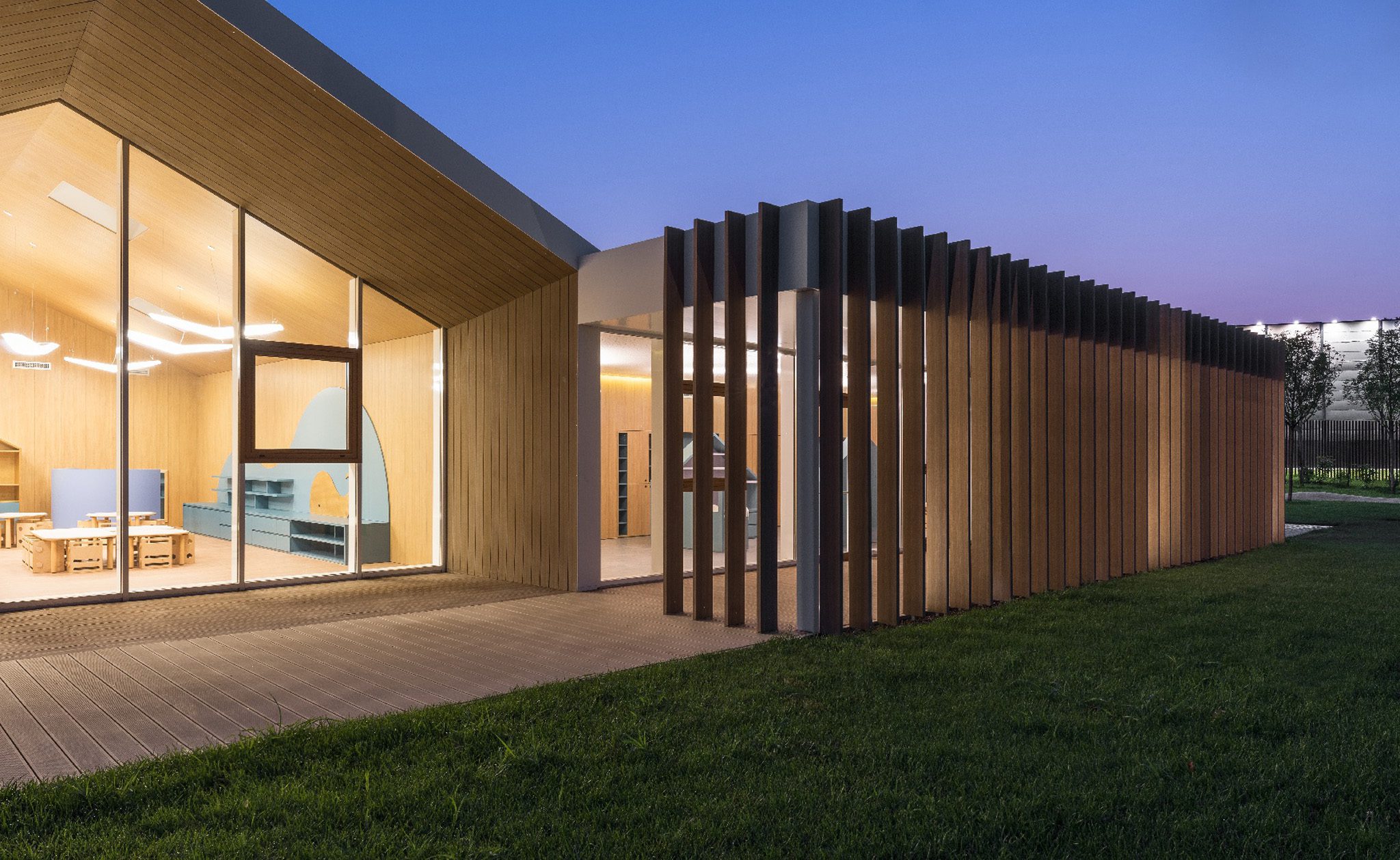 Within the large CityLife urban park, a 173,000 m² green area, stands a kindergarten mainly built in timber, whose construction began in 2017 and occupies a total volume of 6,000 m³. Immersed in approximately 3,000 m² of protected garden, the building offers an innovative interpretation of the school typology: the main volume is broken down into a series of small “houses” connected by a central glazed patio, which serves as the bright, communal heart of the complex.