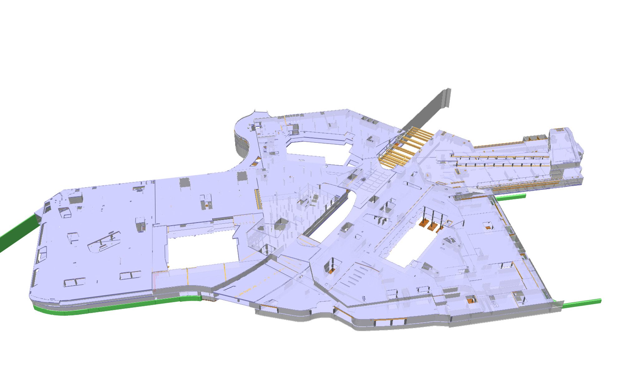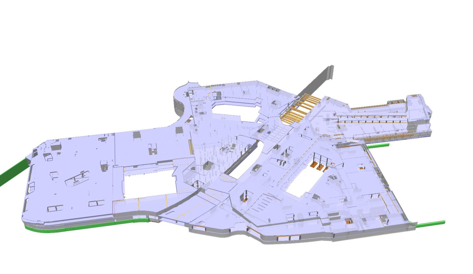 From a construction standpoint, the building was designed using reinforced concrete vertical elements combined with a system of traditional reinforced concrete slabs and post tensioned slabs, a solution essential to meet the high performance requirements, large spans, and complex geometry of the project. Key technical features include clear spans of up to 28 metres, constructed above the new M5 metro line, cantilevered structures extending up to 8 metres, and live loads of up to 6,000 kg/m². These parameters required a highly specialized structural approach, along with rigorous control of deformations and structural interactions.