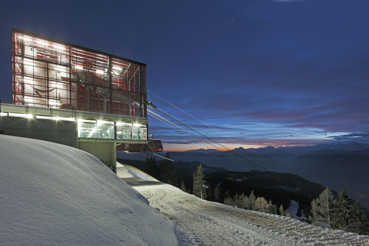The redevelopment of the Monte Ivigna cable car, whose new construction phase began in 2010, aimed to upgrade both the valley and mountain stations to current technical and functional standards. Located on the outskirts of Merano, the lift connects the city with the renowned ski and hiking area of Merano 2000, serving as one of the key infrastructures for tourism and mobility in the region.