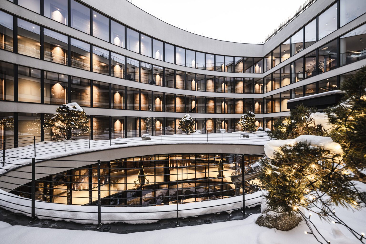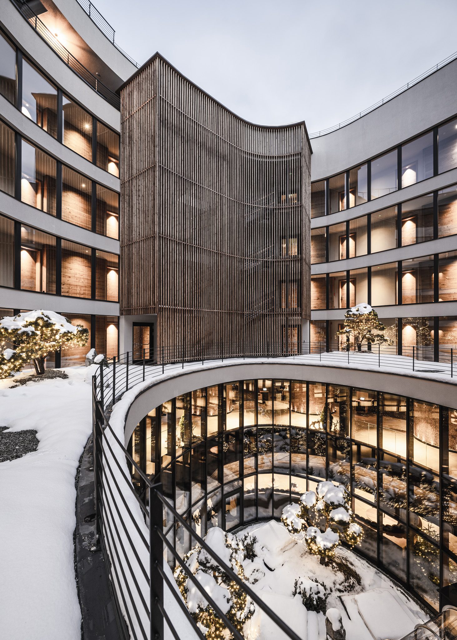 Covering an area of approximately 2,500 m², the new building extends across seven above‑ground levels and two basement floors, designed to accommodate a comprehensive programme centred on well‑being. In addition to its 140 beds, the complex includes an extensive wellness area and dedicated pools, reinterpreting the tradition of Alpine hospitality through a contemporary lens.