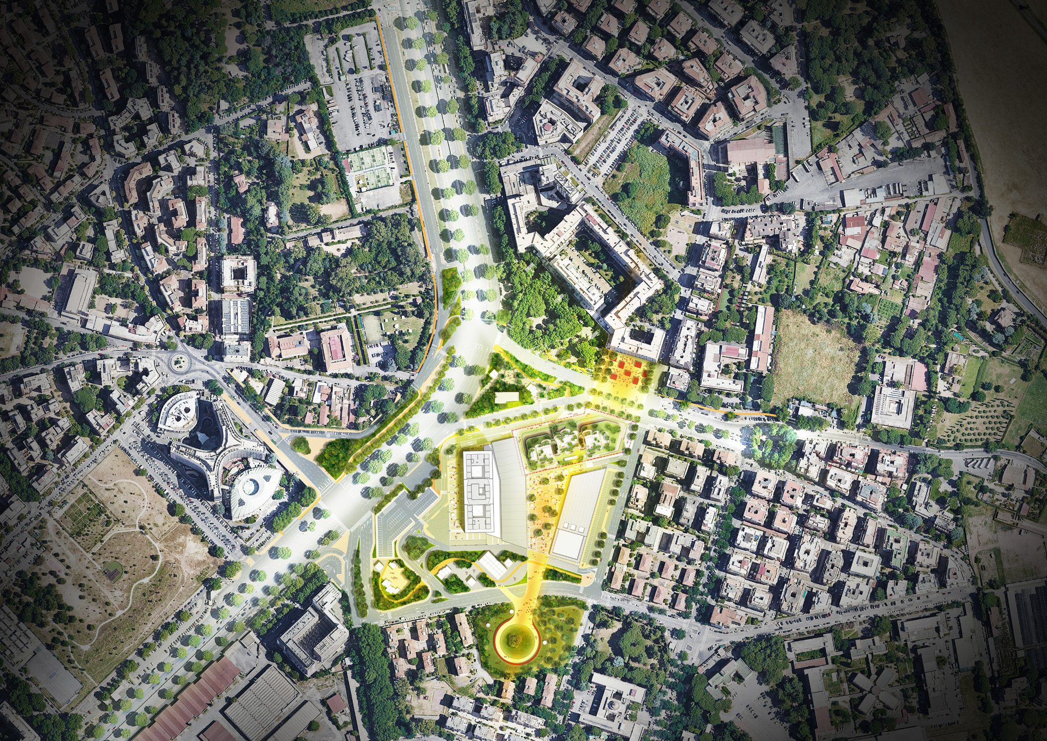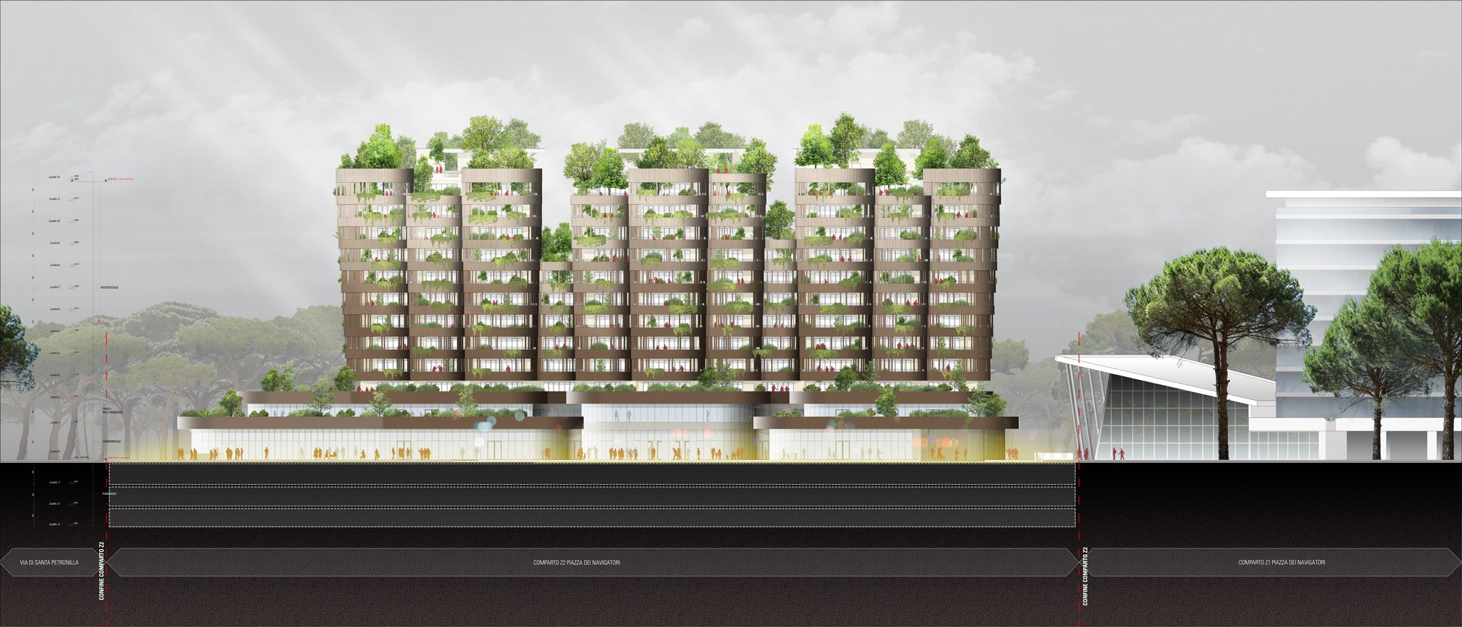 The Piazza Navigatori project, launched in 2022 with a total investment of €50,000,000, stems from the ambition to deeply merge the character of the site with the built environment, shaping an iconic piece of architecture with a strong sense of identity. The building draws inspiration from the trunks of the Italian stone pine: solid, ribbed volumes—structured yet not twisted—rising from a massive podium designed to ensure a firmly grounded base. Between the “scales” of these architectural trunks, lush vegetation interweaves itself into the composition, gradually colonising the structure and integrating it into a wider urban ecosystem.