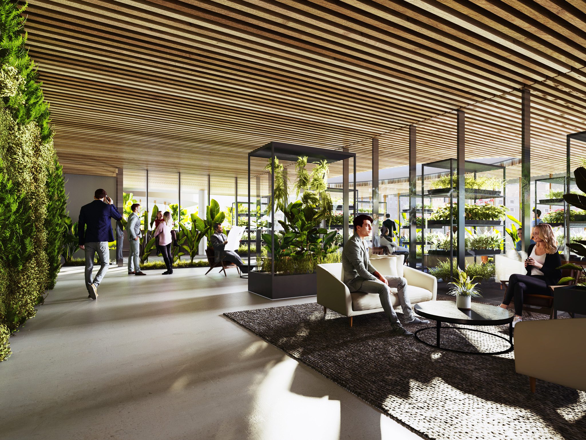 At the top of the buildings, large evergreen trees extend their canopies into the wind, offering protection to the panoramic terrace spaces while mitigating the effects of extreme weather conditions. Botanical species are selected for their adaptability and resilience, with a predominance of evergreens to ensure a consistently vibrant and attractive green presence throughout the year.