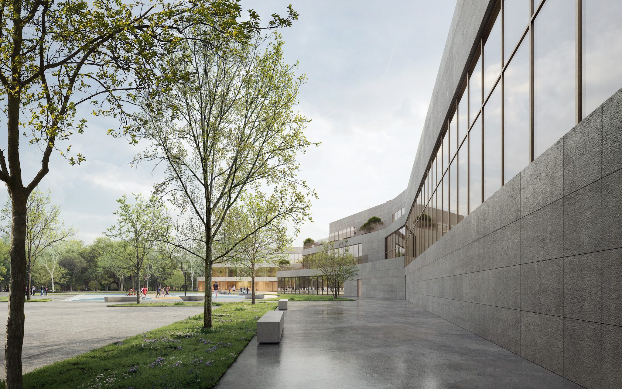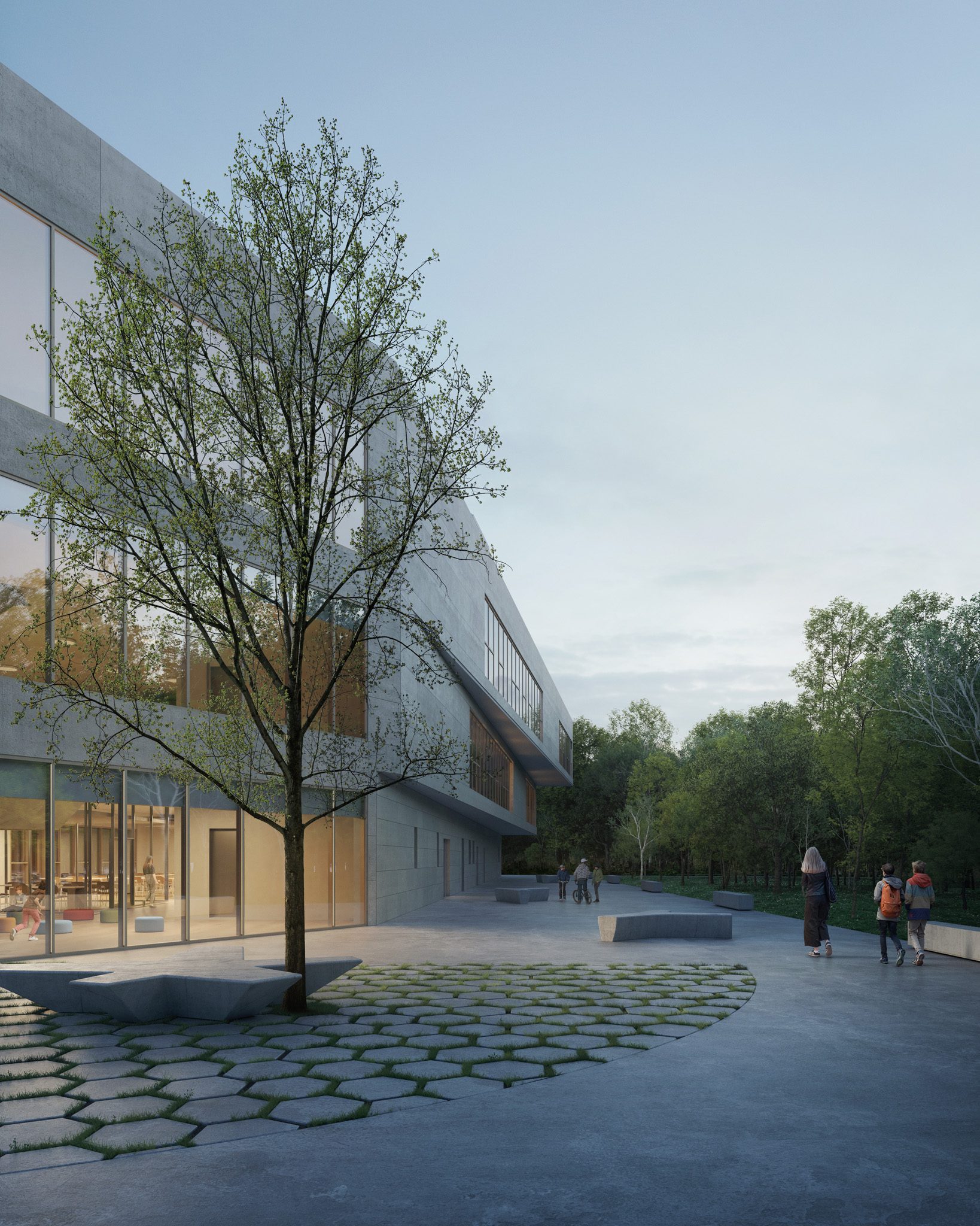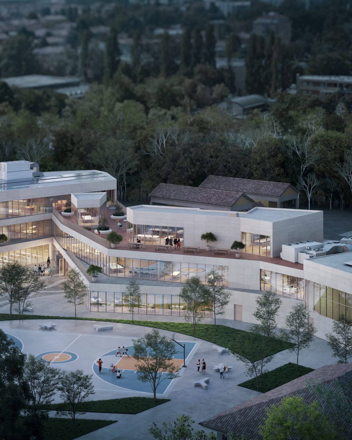 The distinctive zig zag configuration of the building stems from the need to redevelop an area marked by critical site conditions, transforming it into a permeable space open to interaction and community exchange. The intersection of the volumes creates a sequence of wide and flexible spaces designed to host a variety of activities and to be enjoyed by both the school community and local residents.